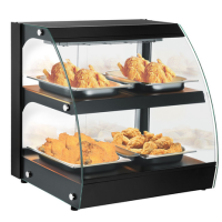 Vitrine de présentation chauffante avec portes arrières coulissantes et panneau avant rabattable pour un remplissage facile. Mise en valeur des produits grâce à son éclairage LED.