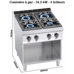 Fourneau à gaz avec 4 zones de cuisson pour les professionnels de la restauration CHR : cafés, hôtels et restaurants. Afin de satisfaire tout type d’établissement et de débit, notre équipement professionnel de qualité vous permettra de réussir à coup sûr tous vos plats. Le revêtement inox utilisé par les fabricants permet à vos cuisiniers et commis de travailler dans les meilleures conditions, et de gagner du temps en fin de service lors du nettoyage des cuisines.