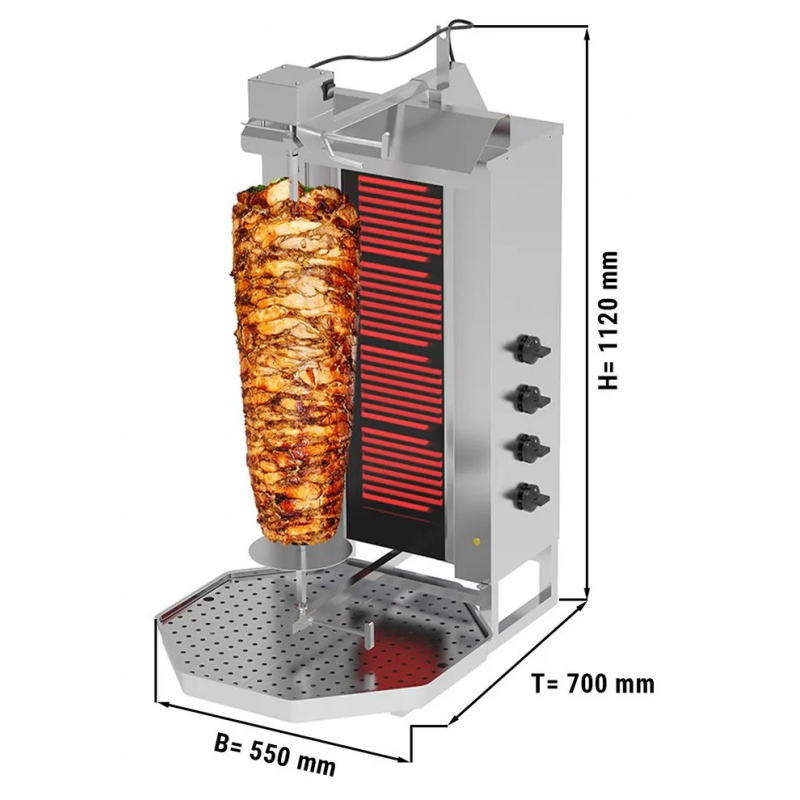 Cette machine à kebab 4 feux est idéale pour un snack avec une fréquentation même importante. Les brûleurs sont très performants cette ligne de Kebabs représente votre meilleur choix en rapport qualité/prix. Vous pourrez y introduire une boule jusqu'à 60 kg ! Vous pourrez ainsi servir à vos clients une viande tendre et savoureuse...