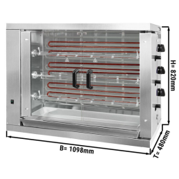 Équipez-vous de cette rôtissoire professionnelle à gaz avec 3 broches pour une capacité maximum de 18 poulets. Avec cette rôtissoire vous proposerez à tous vos clients des poulets bien dorés, bien cuits et surtout très bons. Elle est équipée d'un bac amovible de récupération des graisses, que vous pouvez donc retirer et nettoyer quand vous le souhaitez....
