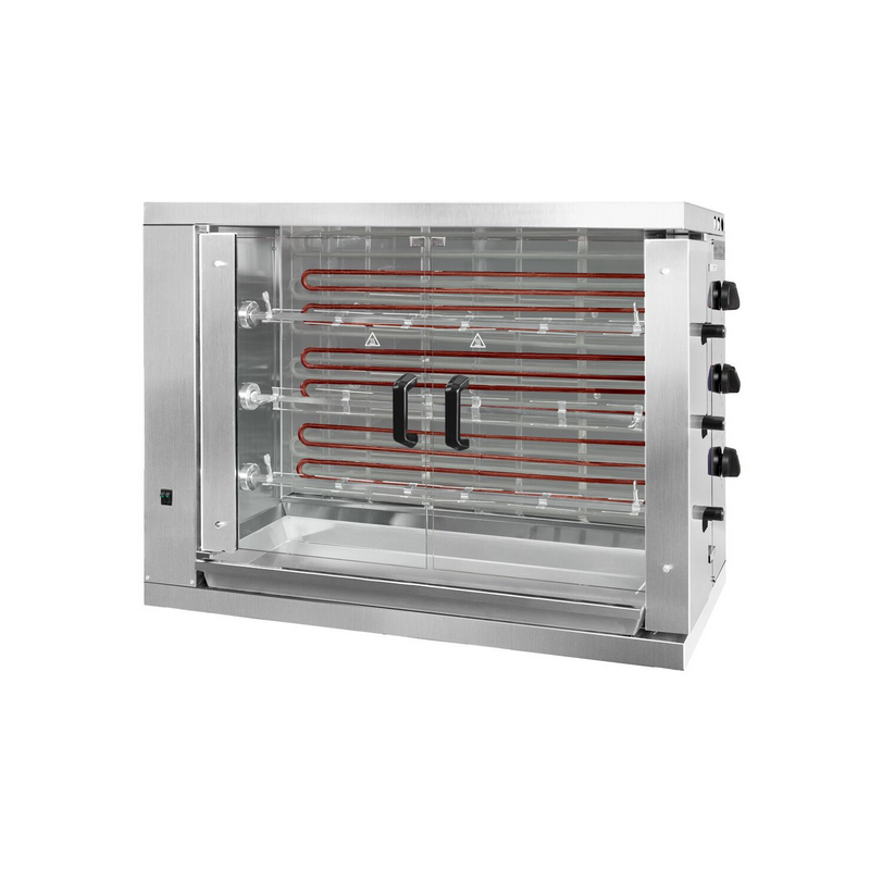 Cette rôtissoire électrique professionnelle équipée d'une ouverture par double-porte battantes vitrées en façade et d'une puissance de 14.4 kW pour une capacité de 3 broches -18 poulets. Elle est composée d'un large bac de récupération, pouvant aussi tenir les légumes, les pommes de terre, etc... au chaud. Avec une cuisson rapide et uniforme, elle sera parfaite pour la cuisson de vos poulets.