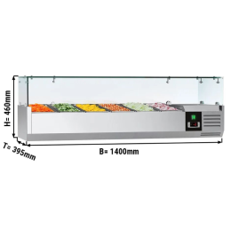 Saladette réfrigérée à poser équipée de verre de protection pouvant contenir 8 x bacs GN 1/3. Cette vitrine à ingrédients réfrigérée est un atout majeur pour toute cuisine professionnelle. Avec son design en acier inoxydable, elle allie élégance et durabilité. Sa capacité de 8 bacs GN 1/3 vous permet de stocker divers ingrédients à une température...