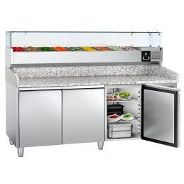 Table à pizza réfrigérée 2 portes en acier inoxydable avec plan de travail en granit et vitrine présentoire réfrigérée.