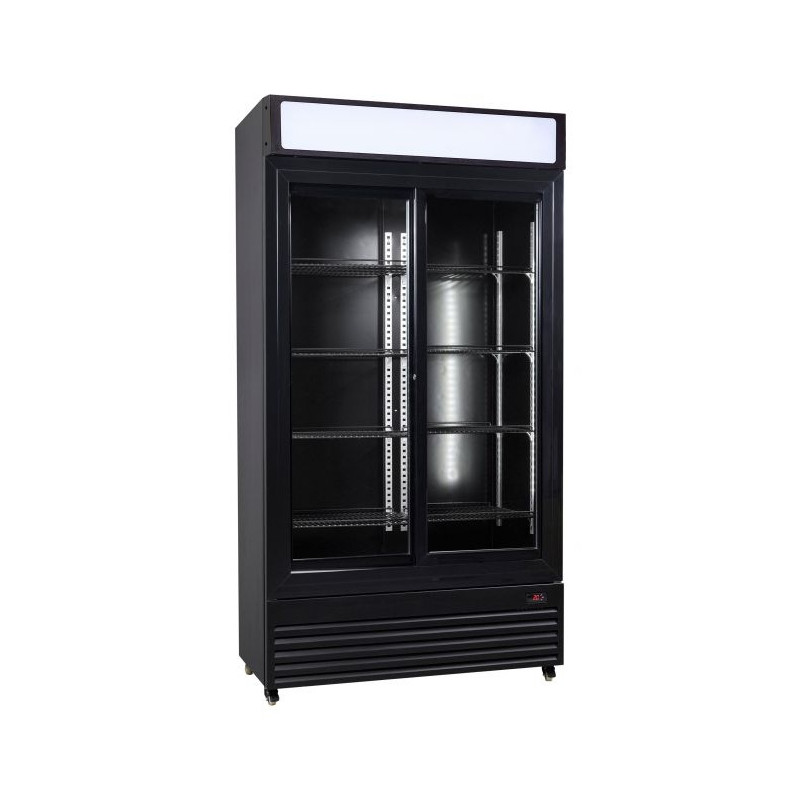 Vitrine à 4 côtés en verre avec partie supérieure avant incurvée et commande numérique de la température pour les boissons froides, les desserts et les produits laitiers. Portes arrière coulissantes pour un accès aisé.
